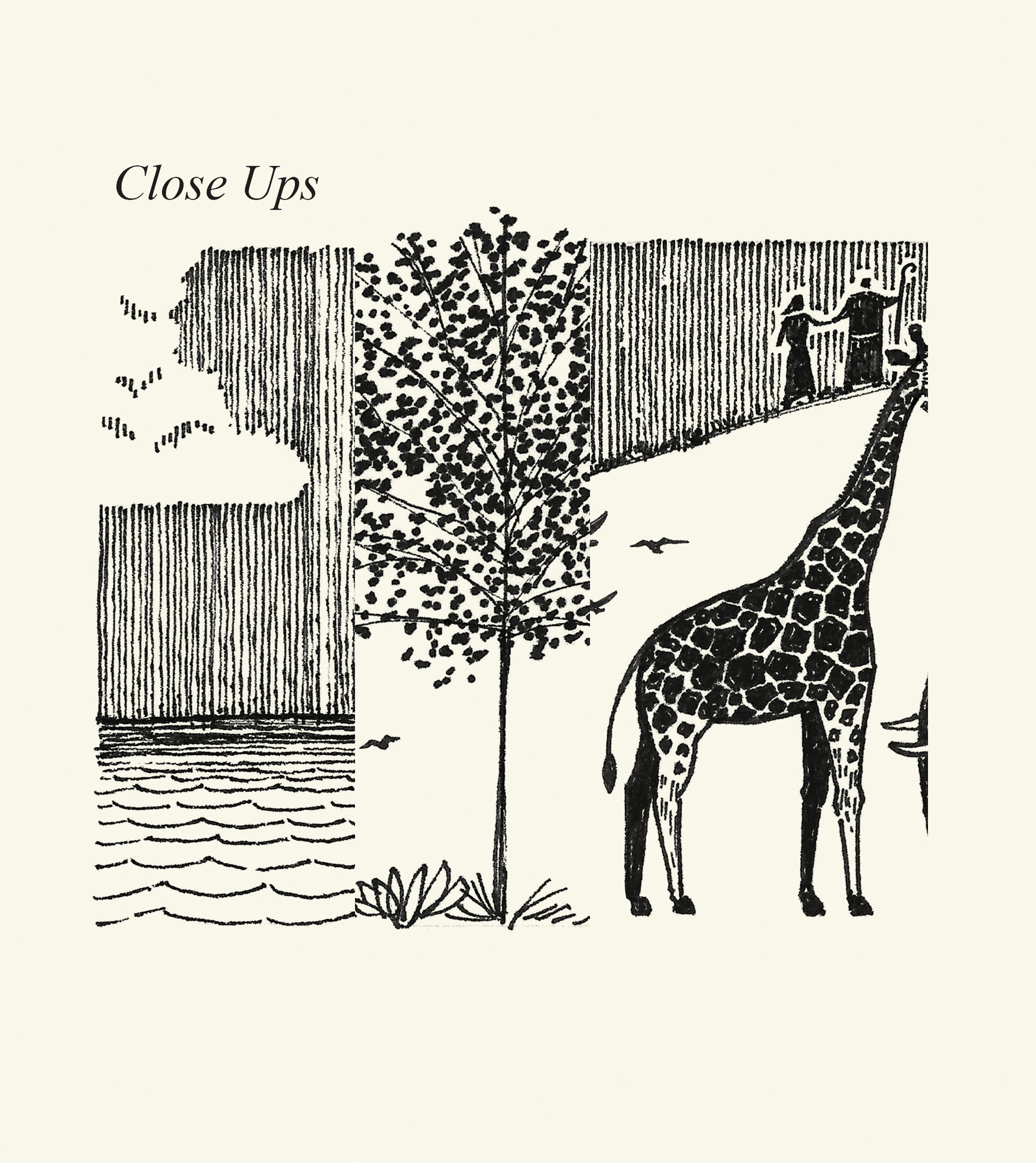 There is an ocean view with clouds, a couple trees with birds, and the right art piece shows two people above a giraffe and elephant since humans take dominion and rule over every living thing on the earth.